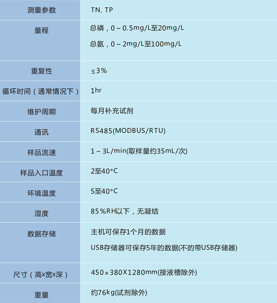 总磷:(符合国标GB11893-89 ):过硫酸盐做氧化剂,在120°C条件下加热消解30 min , 将磷化物转化成磷酸根离子,钼蓝吸光光度法测量总磷含量。(测量波长:700 nm )总氮:(符合标准HJ636-2012): 过硫酸盐做氧化剂,在120°C条件下加热消解30 min , 将含氮化物转化成硝酸根离子,样品溶液的pH调节为2-3;紫外光吸光光度法检测硝酸盐的吸光度。