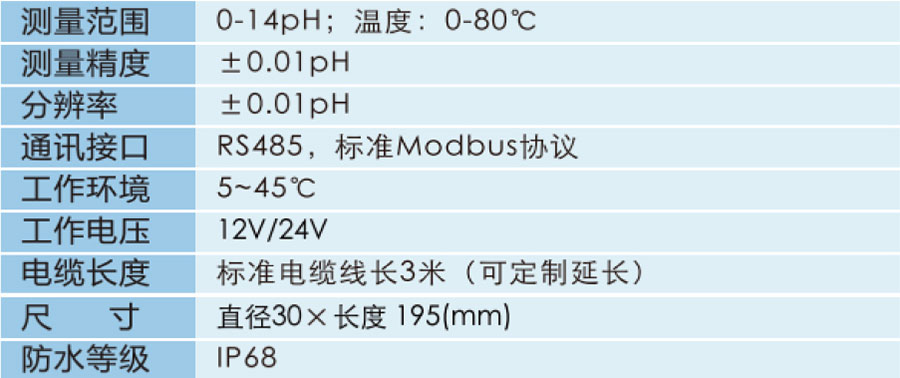 pH描述了水体的酸碱度以及基础特性。pH < 7 . 0 的时 候是酸性的, pH = 7. 0 的时候是中性的,pH > 7 .0 的时候是碱性的。pH传感器使用玻璃指示电极和参比电极组合在一起的复合电极来测量水质的PH